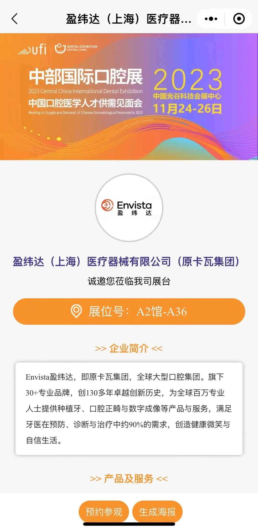 展商信息:包括公司介绍、产品展示、优惠活动等,提供展商管理后台并支持展商自主维护展示。支持一键生成邀观海报,邀请更多专业观众前来参观,促成商贸对接。