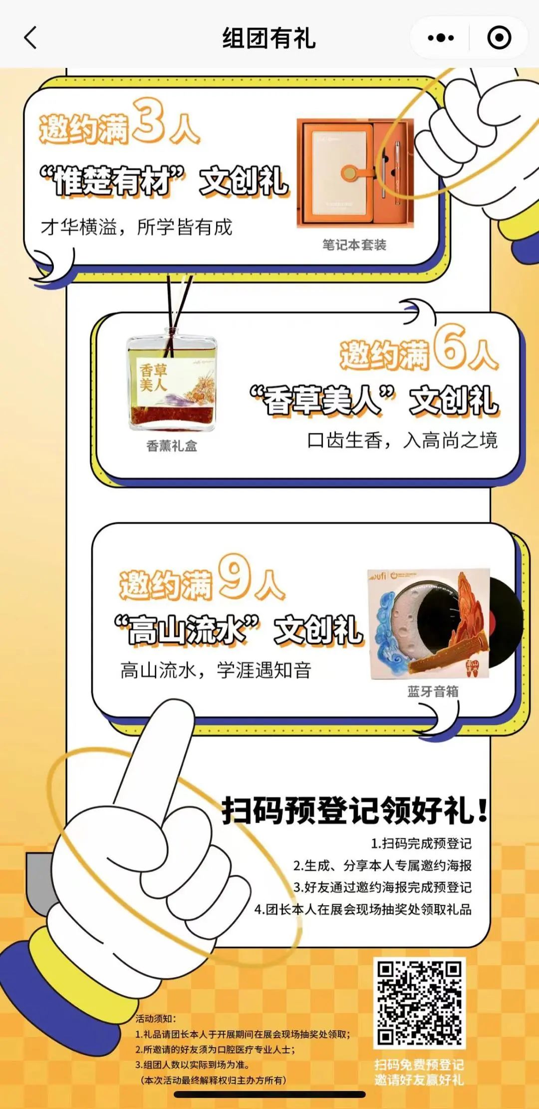 组团邀观:完成免费预登记后,生成并分享个人专属邀请海报,好友通过邀约海报完成预登记,团长本人可在展会现场抽奖处领取礼品。