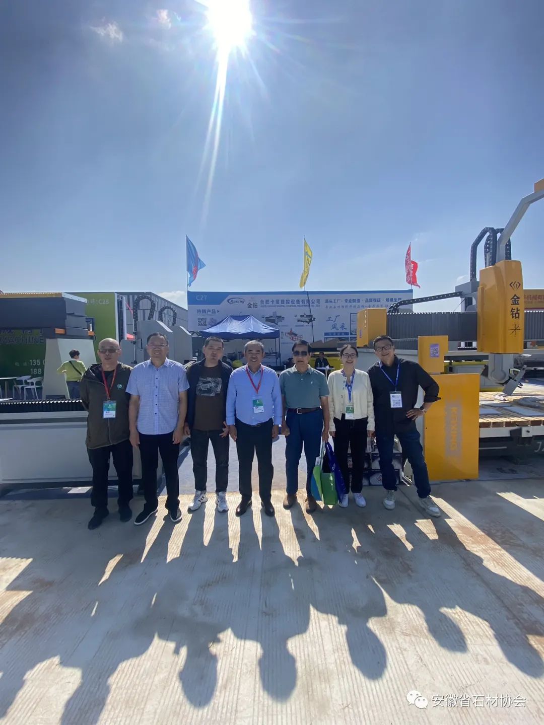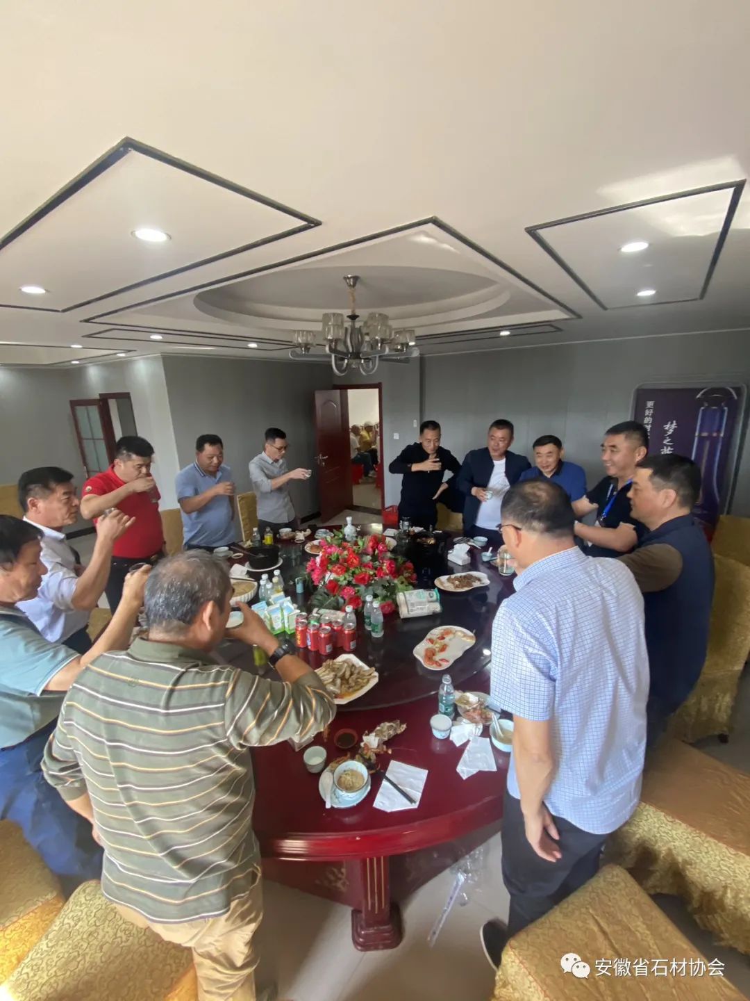 安徽省石材协会会长王欣(右4)、监事长曹平(左2)副会长王子杰(左3)、总工程师马启时(右2)理事陈敬福(前坐者)、金善春(右3)、会员付运生(右1)