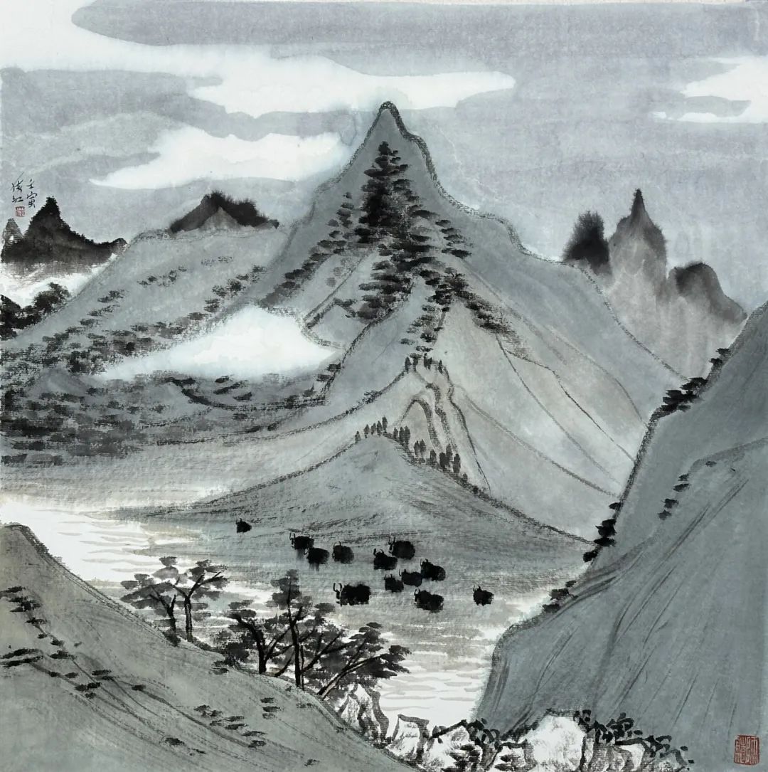 画家张海红将西部主题转化为山水符号和特定的笔墨表现方式。显然,他的笔墨中的西部山水是一种诗情的表达和生命精神的象征。用笔率意书写、墨色氤氲酣畅、层次丰富多变,且在干湿浓淡变化中略加皴擦,富于节奏变化。充满韵律的线在运动中与墨色结合,形成“气从笔出,韵从墨出”的效果。张海红把自然的山体,进行了抽象意味的形式提炼,使起伏的峰峦成为不同形状的几何图形,错位、叠加、并置、整合为变化丰富的抽象图形,构建为一种运动的态势,使作品体现出气韵生动的审美张力、艺术品质和形式美感。面对日新月异的艺术发展,发扬自己的民族文化,坚守自己的地域特色是美术家们应具备的文化自信。画家张海红深耕在自己的沃土中,构筑着自己的精神家园。在那里,他传诵的是苍茫、浑厚的旋律,展示的是历经岁月磨砺的西部山水精神,体现的是生动的生命形式,为新时代的雪域诗情增添着别样画境。