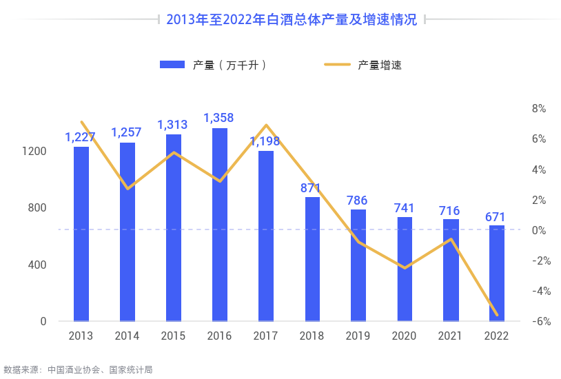 自2017年以来,白酒的年总产量便开始逐年下降。随着产量增速的持续下跌,2019年起产量开始出现负增长,产量增速为-0.8%,2022年该值下滑至-5.6%。2022年,纳入到统计局范畴的上规模白酒企业完成酿酒总产量仅为671万千升,较2017年(1,198万千升)下降约44%。