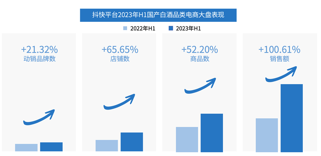 2023年H1,抖快平台白酒品类各项指标均呈现积极增长态势;动销品牌、店铺、商品数均正向增长,白酒社媒市场的稳步扩张,商家积极入场推动销售额增长;2023年H1白酒品类销售额同比增长100.61%,增长迅速,白酒社媒电商市场表现出良好的发展势头。
