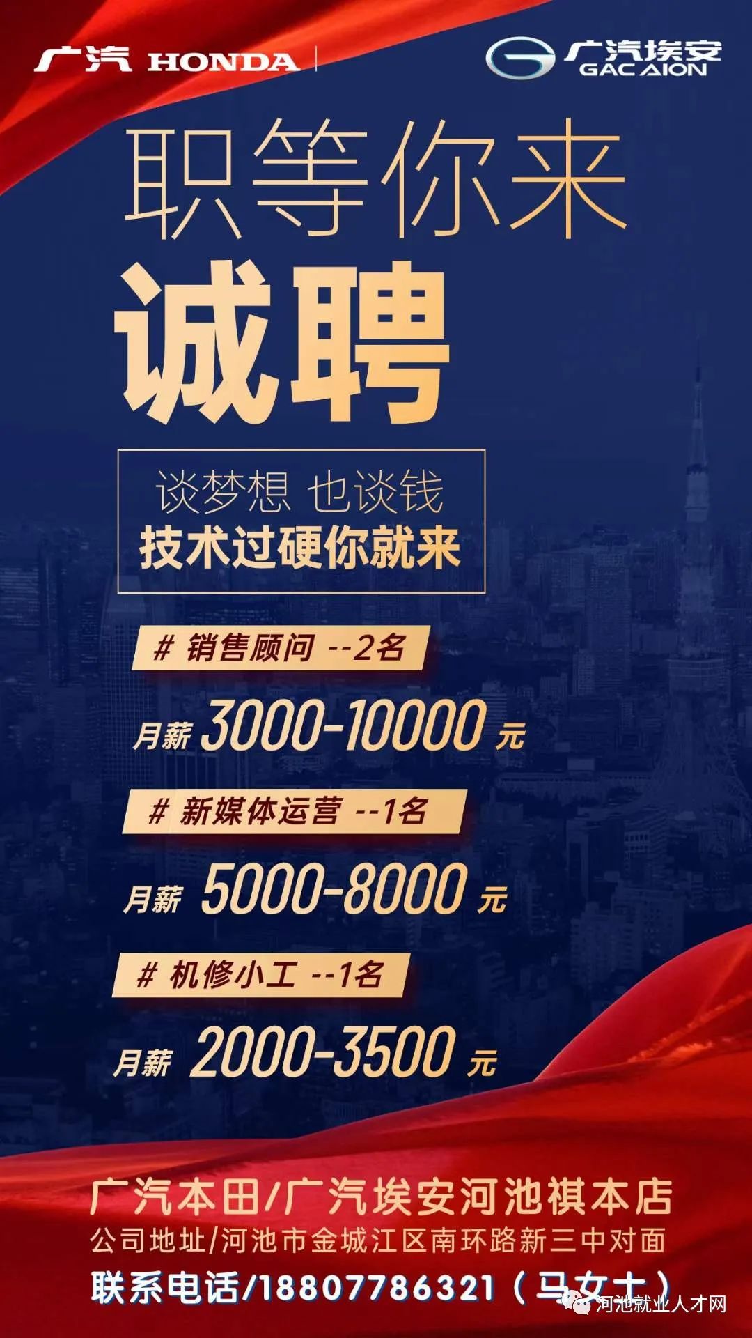 广汽本田/广汽埃安河池祺本店公司招聘以下职位: