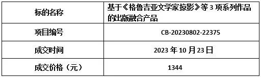受敦煌文艺出版社有限责任公司委托,下列出版融合产品在武汉知识产权交易所成功交易,成交项目1项,成交总金额1344元。