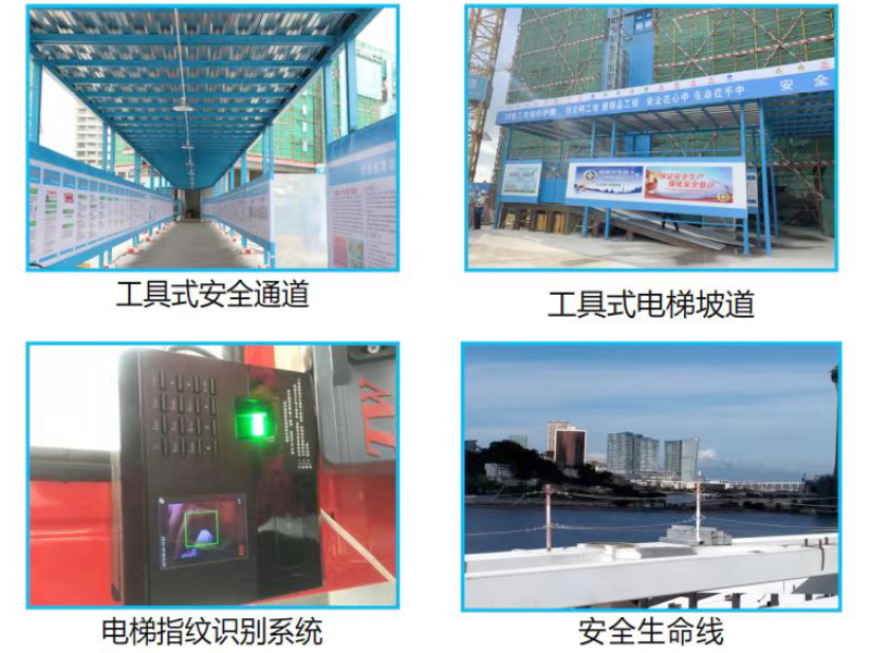 项目严格按照各级政府部门及企业的安全标准化要求,使用工具式安全通道、临边洞口防护、标准化钢筋车间、泵管加固措施、标准化移动式三级电箱,配置工业插座,现场设置消防泵控制室、应急救援仓库、永临结合消防系统等保证现场安全文明施工,实现快装快拆、周转使用、环保经济的综合效益。