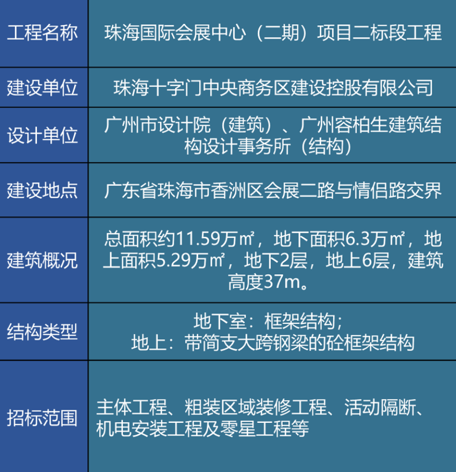 珠海国际会展中心二期项目地处澳门与珠海交界的十字门CBD,由中建三局第一建设工程有限责任公司承建,总建筑面积11.6万平方米,建筑高度37米,地下2层,地上6层,为带简支大跨钢梁的混凝土框架结构;项目是珠三角功能最完善、配套最齐全、设施最先进的专业场馆。建成后,为大湾区经济建设发挥巨大纽带作用。