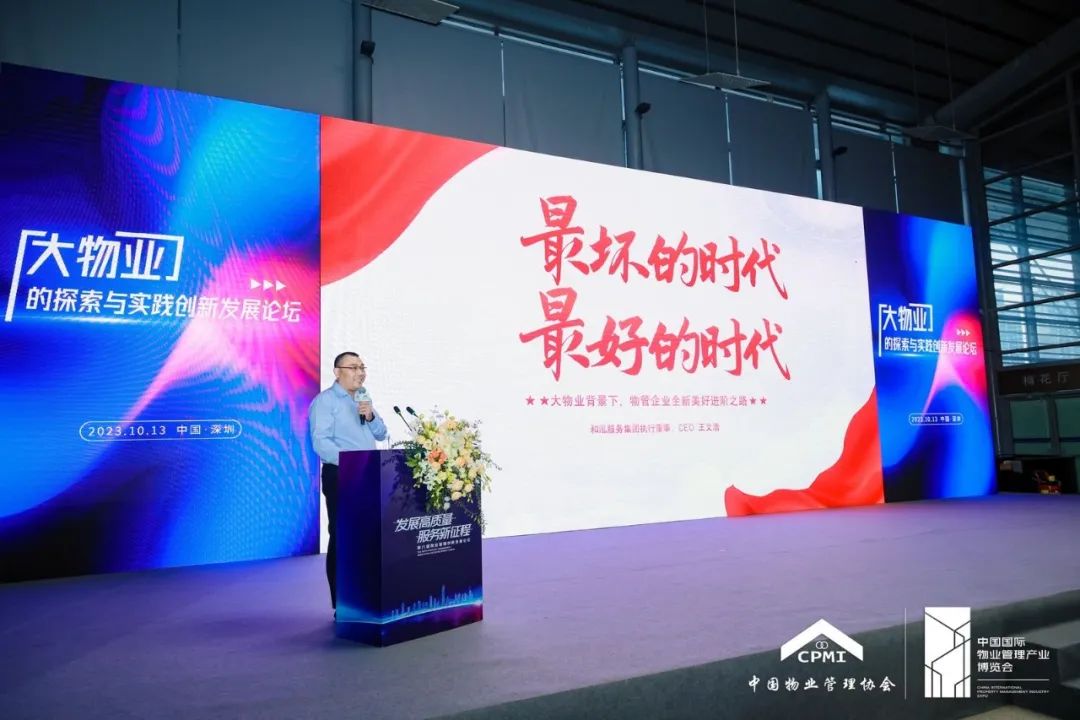 10月13日,和泓服务集团执行董事、CEO王文浩在深圳会展中心做了题为“最好的时代·最坏的时代——大物业背景下,物管企业全新美好进阶之路”的主题演讲。分析了目前物业服务企业所面临的机遇和挑战,并分享了和泓服务集团党建引领、“四个坚持”和“六化六感”文化战略、五享服务体系、社区增值、科技赋能等内容。最后,王文浩提出了不忘服务初心,回归以客户为中心的本质,坚持务实、专业、长期的工作作风等号召,共同为物业管理行业发展作贡献。