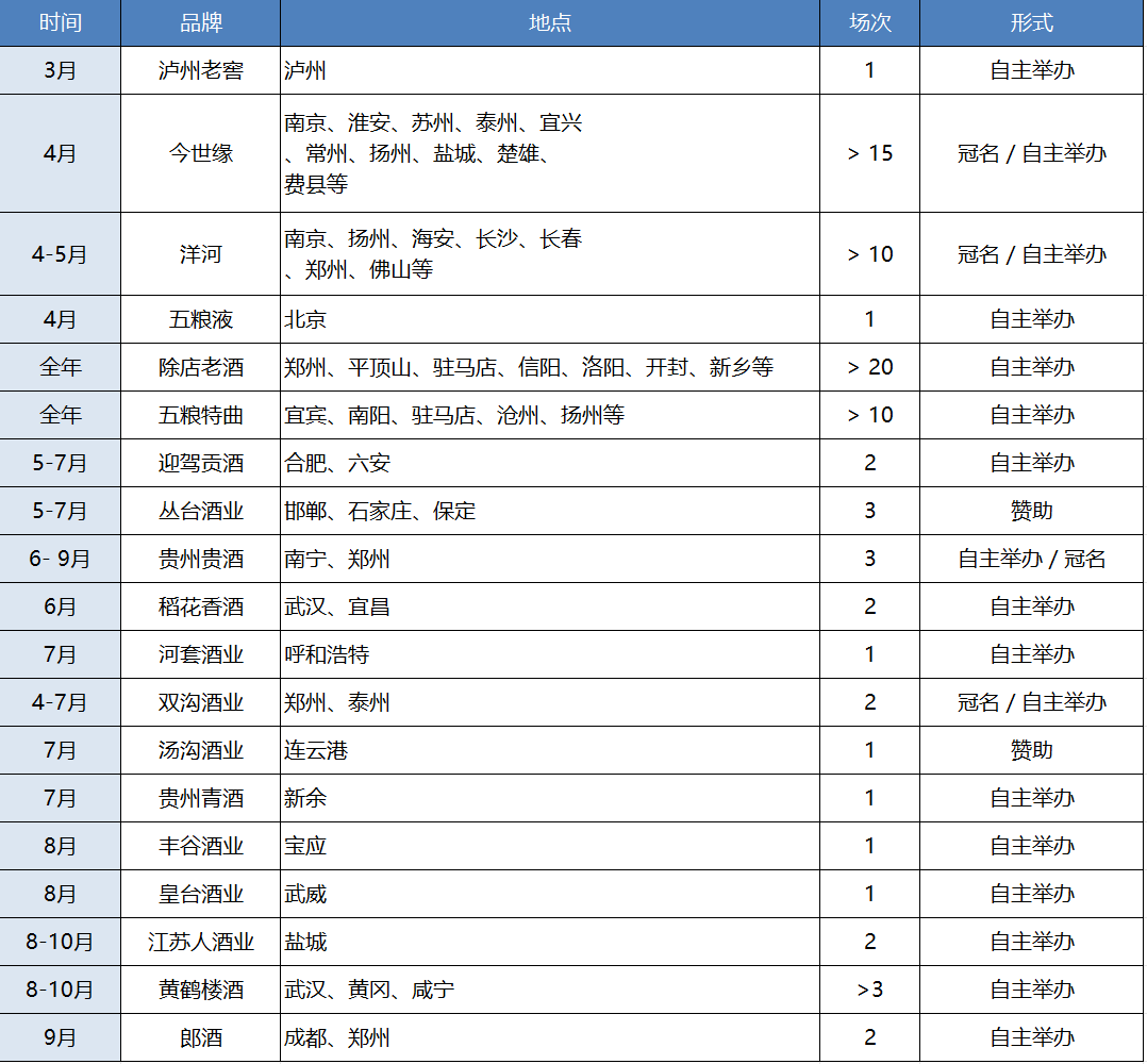 其中重要形式例如音乐节、演唱会。3月,泸州老窖·国窖1573“荣耀盛典”巨星演唱会在泸州奥体中心活力开唱,五粮液首场“五粮特曲 焕新传承”水木年华万人演唱会在宜宾唱响……进入2023年以来,五粮液、洋河、泸州老窖、郎酒、国台等众多白酒企业,都已通过演唱会或音乐会的形式开展面向消费者的文化活动,预计2023年全年白酒行业将上演超过80场演唱会,且场均规模在千人以上。