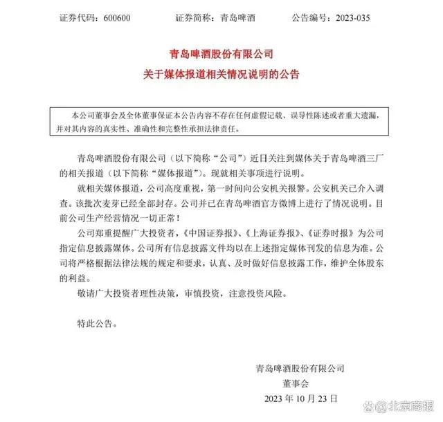 另外,就在10月23日盘前,青岛啤酒发布公告称,近日关注到媒体关于青岛啤酒三厂的相关报道。就相关媒体报道,公司高度重视,第一时间向公安机关报警。公安机关已介入调查。该批次麦芽已经全部封存。公司并已在青岛啤酒官方微博上进行了情况说明。目前公司生产经营情况一切正常。