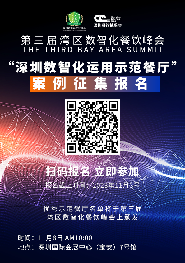 2023第三届湾区数智化餐饮峰会,将对数智化应用具有突出表现的餐饮企业进行授牌表彰,现向全深圳征集优秀数智化运用餐厅报名!