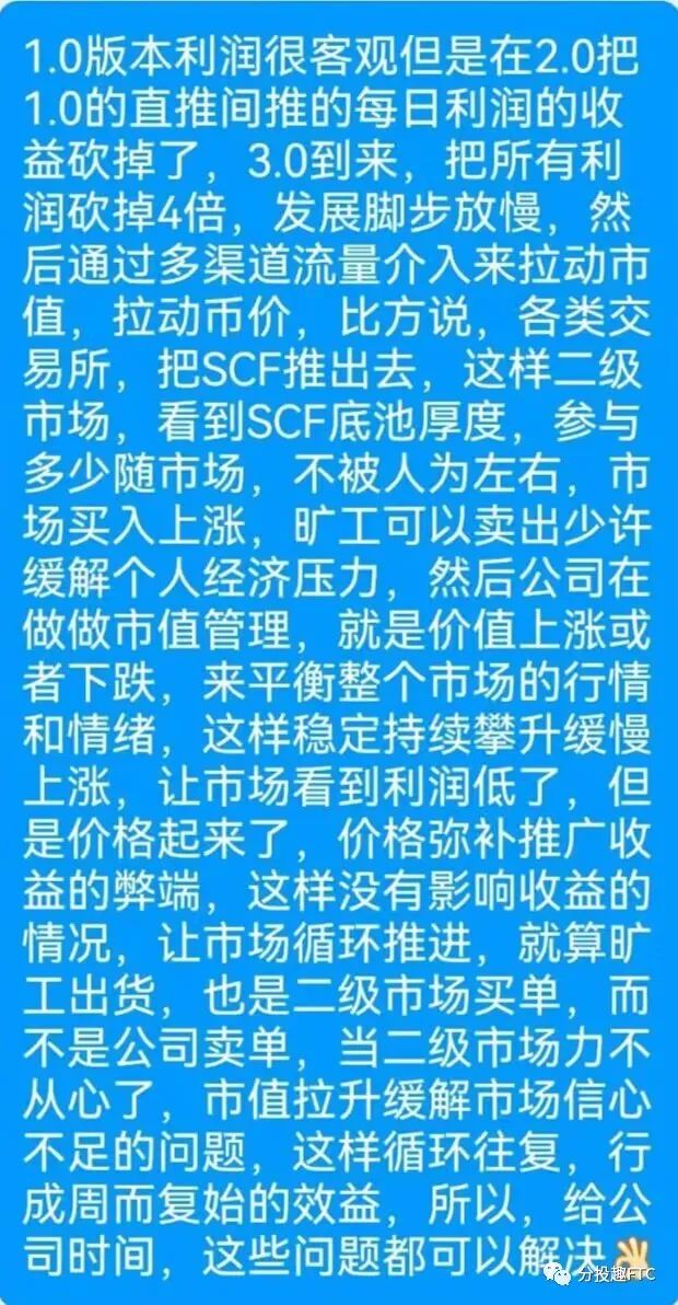 1.0版本利润很客观但是在2.0把1.0的直推间推的每日利润的收益砍掉了,3.0到来, 把所有利润砍掉4倍,发展脚步放慢,然后通过多渠道流量介入来拉动市值,拉动币价,比方说,各类交易所,把SCF推出去,这样二级市场,看到SCF底池厚度,参与多少随市场,不被人为左右,市场买入.上涨,旷工可以卖出少许缓解个人经济压力,然后公司在做做市值管理,就是价值上涨或者下跌,来平衡整个市场的行情和情绪,这样稳定持续攀升缓慢上涨,让市场看到利润低了,但是价格起来了,价格弥补推广收益的弊端,这样没有影响收益的情况,让市场循环推进,就算旷工出货,也是二级市场买单,而不是公司卖单,当二级市场力不从心了,市值拉升缓解市场信心不足的问题,这样循环往复,行成周而复始的效益,所以,给公司时间,这些问题都可以解决出。