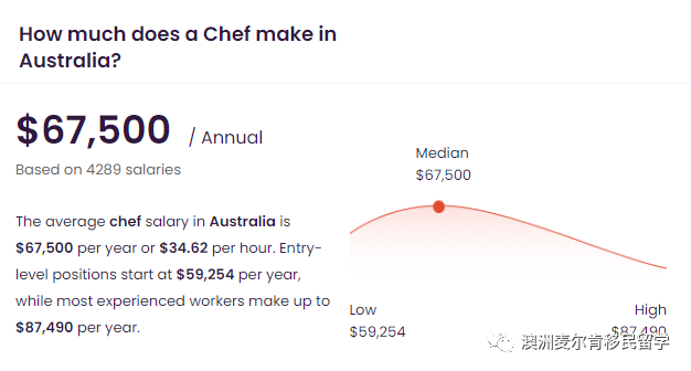 厨师的薪资是较高的。根据澳洲官方数据最新统计显示:厨师相关的平均工作薪资为每年67,500澳元或每小时34.62澳元。刚入职的新手工资在59,254澳币,资历丰富的厨师可以拿到87,490澳币。