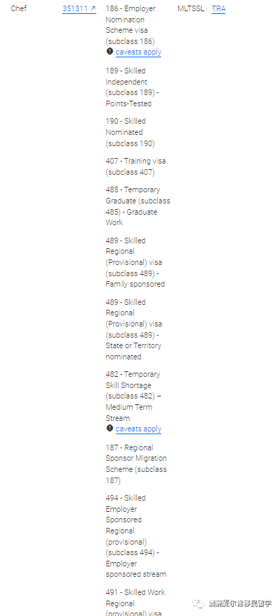 厨师的职业清单是MLTSSL,评估机构是TRA,可以申请的签证是雇主担保签证186、482中期、494;技术移民签证189、190、491。