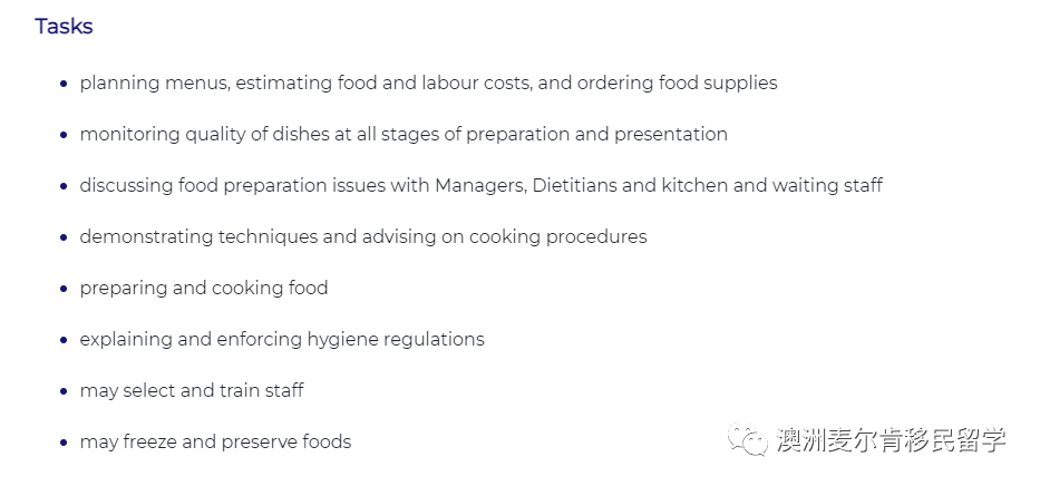 这个职业申请的澳洲签证很多,但是它指的是主厨,如果你只是在快餐店炒菜,这个职业的职业评估拿不到。如果你在有堂食,正规的餐厅工作,工作内容有制定菜单、管理后厨人员等,这是可以通过职业评估。
