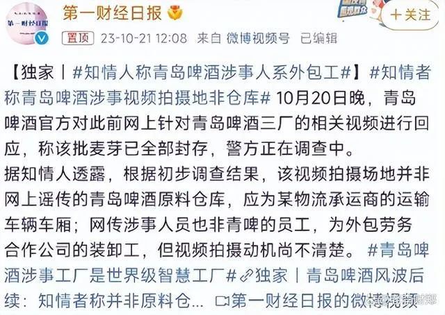 10月21日,事情似乎迎来了反转,知情人透露,该视频拍摄场地并非网上谣传的青岛啤酒原料仓库,应为某物流承运商的运输车辆车厢,网传涉事人员也非青岛啤酒员工,为外包劳务合作公司的装修工。有专业人士指出,确实为运输车辆,并且对比青岛啤酒员工工作服,证明所言非虚。