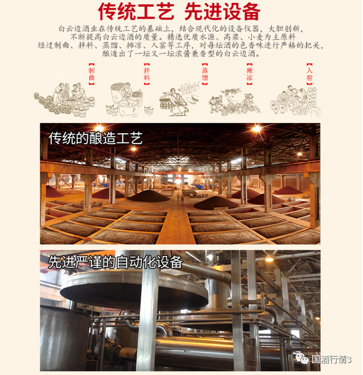 白云边是浓酱兼香型,其生产工艺的特点可简单描述为“前酱后浓,三高一长”,即前六轮为酱香型生产工艺,后三轮为浓香型生产工艺,使其口感既有兼香的细腻丰满,又有浓香的醇厚绵柔。