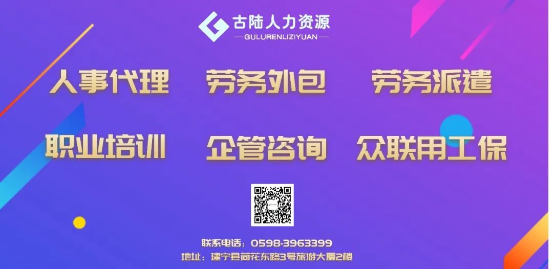 福建省古陆人力资源有限公司成立于2019年7月,注册资金1000万元人民币,是一家经过上级人社局、市场监督管理局批准注册成立的专门为各类用工单位提供劳务派遣、劳务外包、培训考证、人力资源管理的专业服务机构;以及长期为各类求职者提供就业信息、劳动政策咨询、职业介绍、薪酬福利管理等人力资源综合服务机构。