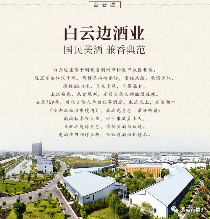 白云边座落于湖北省荆州市松滋市城区北端。这里东临江汉平原,西倚巫山岭余脉,南接武陵,北滨长江,海拔68.4米,多东南风,气候温和,土沃粮优,泉甘风冽,是历史悠久的酿酒胜地。公元759年,唐代大诗人李白秋游洞庭,乘流北上,夜泊湖口(今湖北松滋市境内),籍湖光月色,举杯吟诗:南湖秋水夜无烟,耐可乘流直上天,且就洞庭赊月色,将船买酒白云边。美酒绝句相得益彰,白云边酒由此得名。