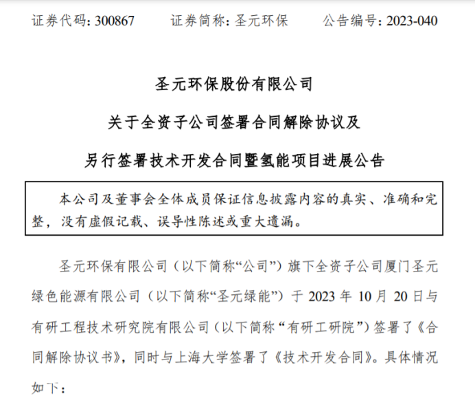 10月23日,圣元环保股份有限公司(简称:圣元环保)发布公告称,其旗下全资子公司厦门圣元绿色能源有限公司(简称:圣元绿能)已于10月20日与有研工程技术研究院有限公司签署了《合同解除协议书》,同时与上海大学签署了《技术开发合同》,继续推进高性能TiFe系储氢合金研发项目的实施。