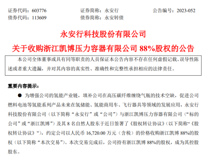 交易完成后,永安行与浙江凯博将充分发挥各自优势,致力于研发更安全、更轻量、更高压的高压储氢瓶,扩展永安行氢能系列产品的应用空间,提升公司氢能产业的综合竞争力。