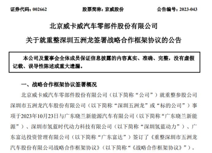 10月23日,北京威卡威汽车零部件股份有限公司(简称:京威股份)发布公告称,将就重整参股公司深圳市五洲龙汽车股份有限公司事项与广东晓兰新能源汽车有限公司、深圳市氢蓝时代动力科技有限公司、广东富达投资管理有限公司签订了《重整深圳市五洲龙汽车股份有限公司战略合作框架协议》。