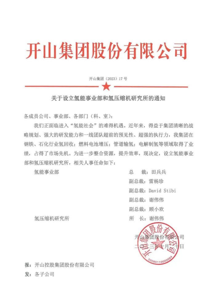 10月20日,开山集团股份有限公司(简称:开山集团)发出通知,将设立氢能事业部和氢压缩机研究所,旨在整合资源,提升效率。