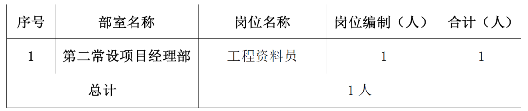 本次天津城建集团有限公司共计招聘1个岗位,岗位编制共计1人具体岗位和编制明细如下表: