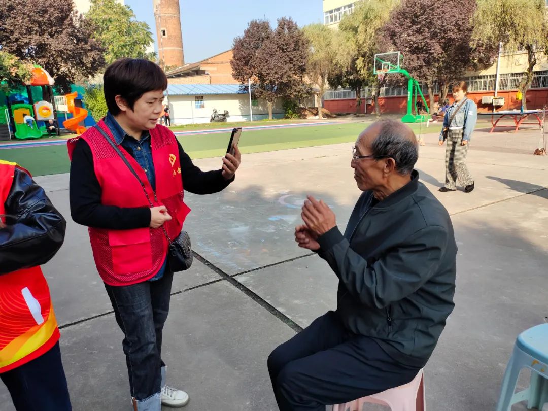 社区志愿者为老人认证养老保险