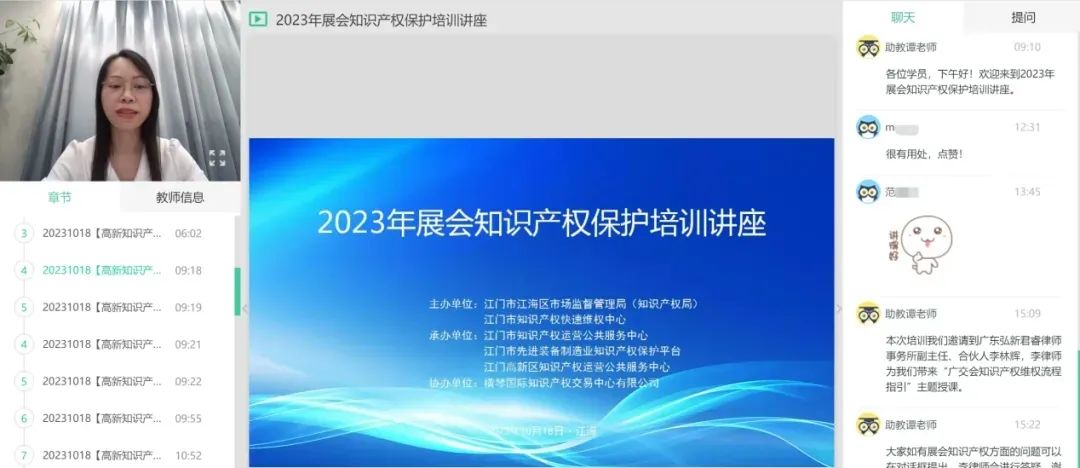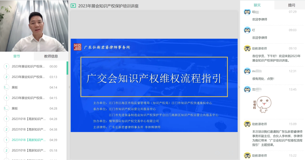 为贯彻落实国家知识产权局印发的《展会知识产权保护指引》,强化江海区展会知识产权保护工作建设,增强企业展会知识产权保护和风险防范意识,10月18日,2023年展会知识产权保护培训讲座顺利举行。本次培训由江门市江海区市场监督管理局(知识产权局)与江门市知识产权快速维权中心主办,江门市知识产权运营公共服务中心、江门市先进装备制造业知识产权保护平台、江门高新区知识产权运营公共服务中心承办,横琴国际知识产权交易中心有限公司协办。