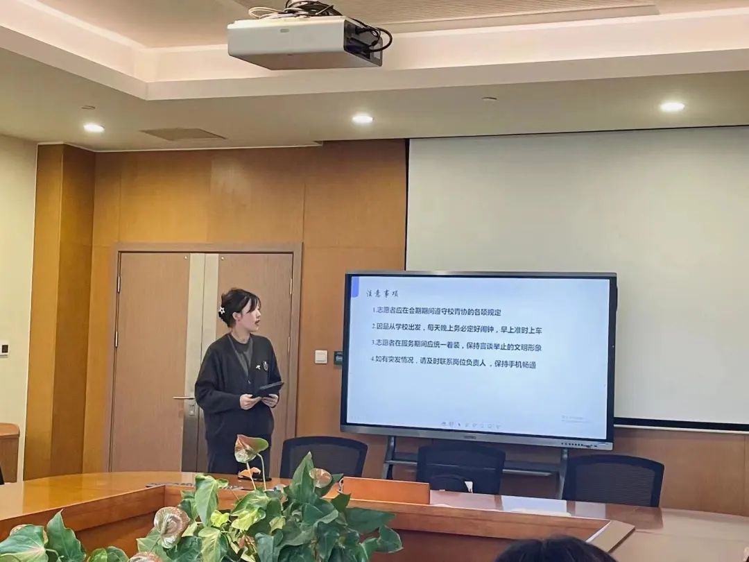 在本次会议上,团总支文体部的朱奕欣同学从进博会场馆布局、急救学习、常用口语分享以及注意事项四方面进行了系统介绍,并对志愿者们强调了进博会服务的特殊性,以院级培训的形式帮助志愿者们更好的进行会期的志愿服务工作。