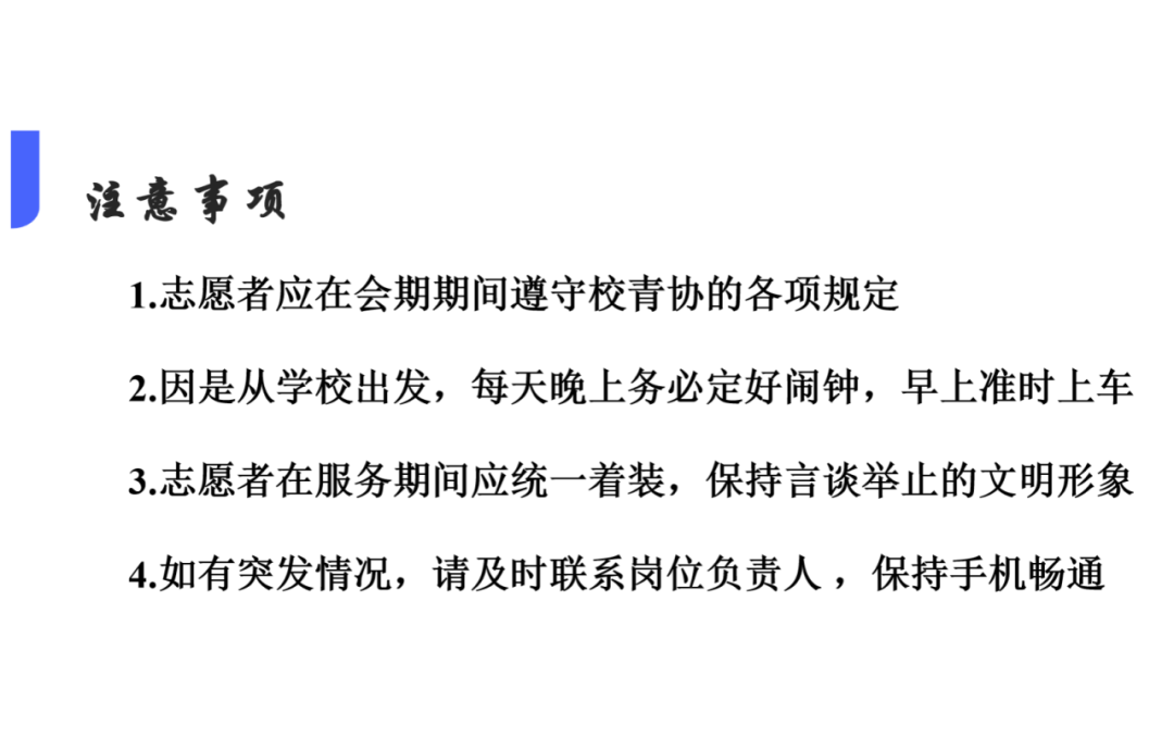 最后,她进行了注意事项的讲解,并强调在进博会上健医小叶子是一个团队,展现的是整体的精神面貌。希望第六届的小叶子们能够在志愿服务能够遵守各项规定,展现我校我院小叶子的文明服务形象。