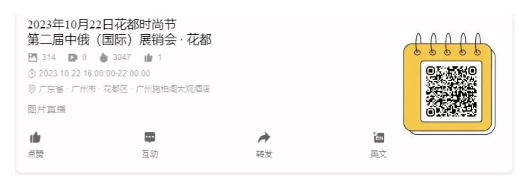 2023年10月22日下午,在广州花都施柏阁大观酒店举办的2023广州花都时尚节系列活动之第二届中俄(国际)展销会圆满成功!本次展会来自俄罗斯近300位采购商以及300多家广州本土时尚企业(现场摆展近100家)齐聚一堂,开展面对面贸易洽谈,共商合作发展大计。当日活动照片可以扫描下方图片二维码查看!