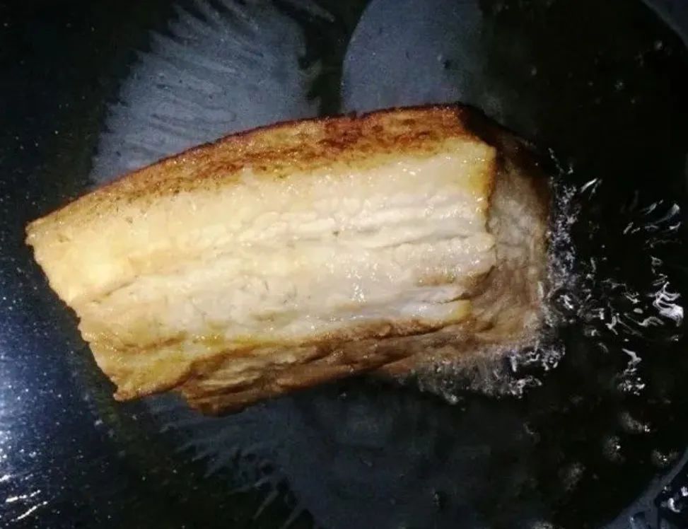 4、当五花肉不再溅油后,用筷子给五花肉翻面,把6个面都煎至焦黄后捞出沥油。不烫手后,用刀切成薄片,加入食盐、生抽、老抽、料酒、冰糖、葱姜,用手抓匀后腌制30分钟。