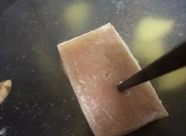 2、带皮五花肉洗干净,不用切,整块放入冷水中,加入葱段、姜片、八角、料酒,大火煮开后小火煮20分钟,能用筷子扎穿后捞出沥干水分。