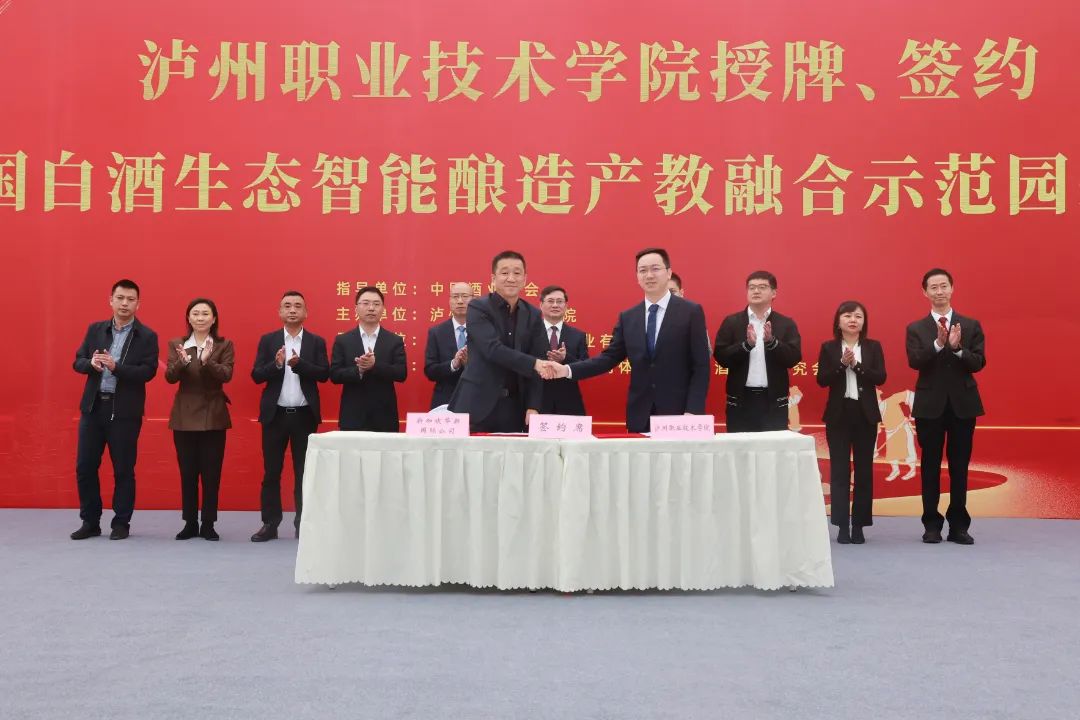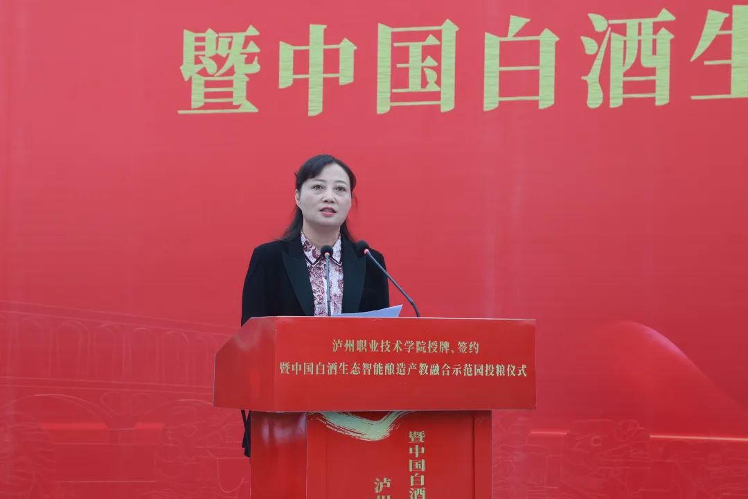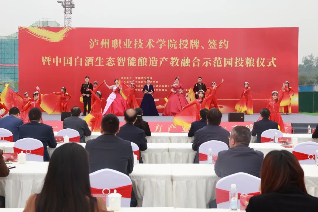 本次活动流程衔接紧凑、内容丰富,共分为“国家职业教育研究院泸永江研究基地”授牌仪式、颁发四川省酒文化研究会第三届理事会名誉理事长聘书、泸州职业技术学院校企合作签约仪式、“丝路电商产业学院”揭牌仪式以及中国白酒生态智能酿造产教融合示范园投粮仪式等内容。泸州市人民政府副市长罗素平、中国酒业协会副秘书长甘权以及泸州职业技术学院党委书记何杰等领导出席仪式并发表讲话。