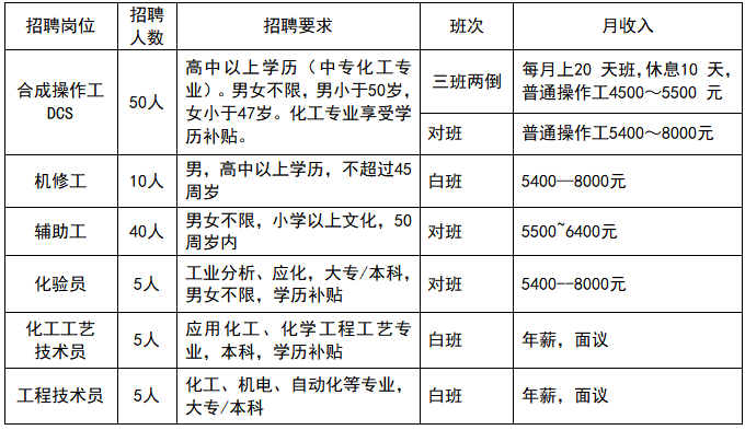 1、工资每月按时发放,工作餐免费,外地员工免费公寓式提供住宿或租房补贴。2、入职后即办理工伤、养老、医疗、生育、失业等保险,享受工龄、持证、学历等专项补贴。3、重大节日(国庆、春节)享受带薪休假,年终发奖金,健康体检、生日庆贺。5、自动化程度高,劳动强度小,男女不限,全年正常上班。1、年满18周岁,身体健康无残疾,无精神病、癫痫病史、心脏病、肺结核。体检合格,岗前培训达到要求。联系方式: 人事部 栾先生: 13952530433 周女士 15952544951