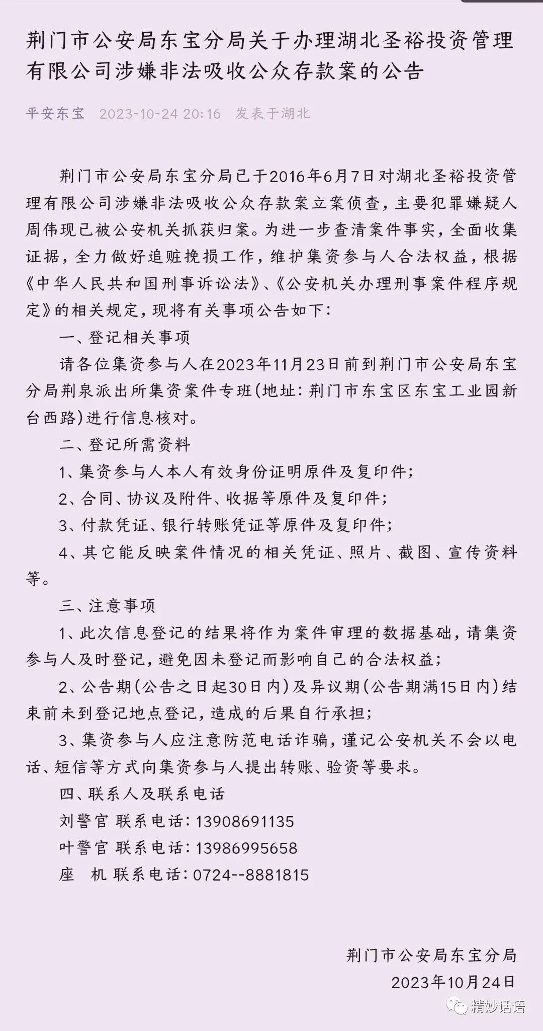 2023年10月24日,荆门市公安局东宝分局对外发布了关于办理湖北圣裕投资管理有限公司涉嫌非法吸收公众存款案的公告。具体如下: