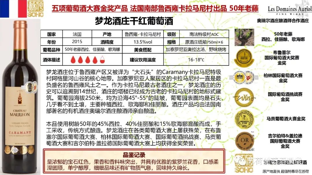 梦龙酒庄干红葡萄酒,五项国际金奖,50年老藤。呈浓郁的宝石红色,果香和香料味突出,并具有优雅的紫罗兰花香,口感柔滑圆顺,单宁醇厚,细细品味还有矿物质气息,回味持久绵长。预订请拨打043184506666或咨询苏荷酒业相关选酒顾问。