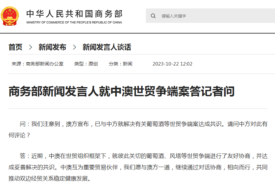10月22日中午,商务部发布消息称:中澳在世贸组织框架下,就彼此关切的葡萄酒、风塔等世贸争端进行了友好协商,并达成妥善解决的共识。一石激起千层浪,僵持多年的中澳贸易争端即将破冰,并取得进展。