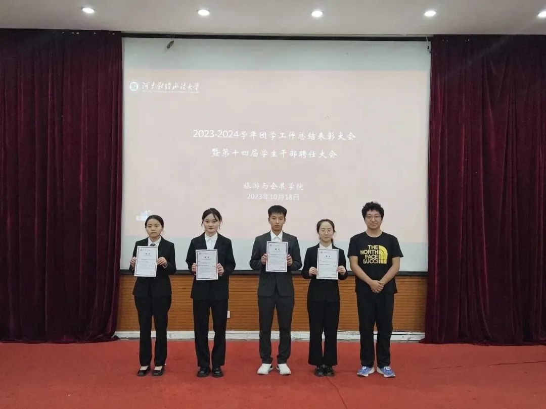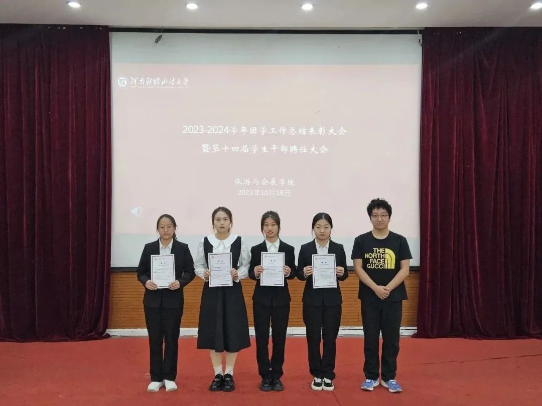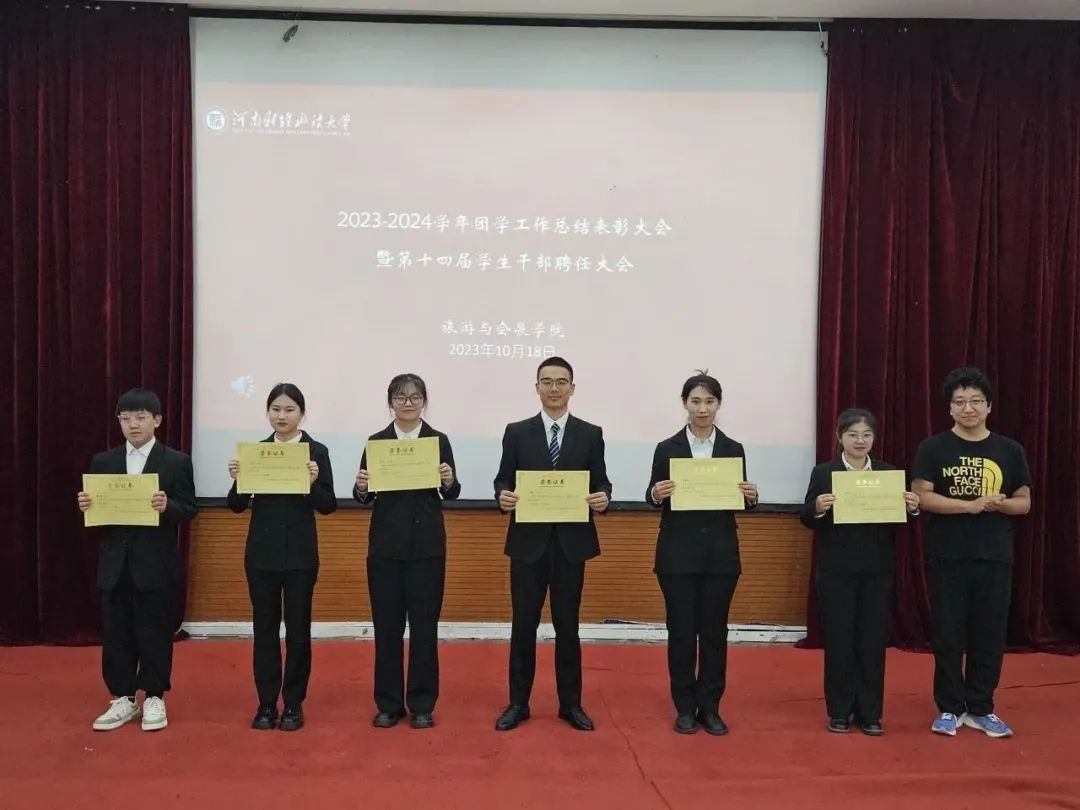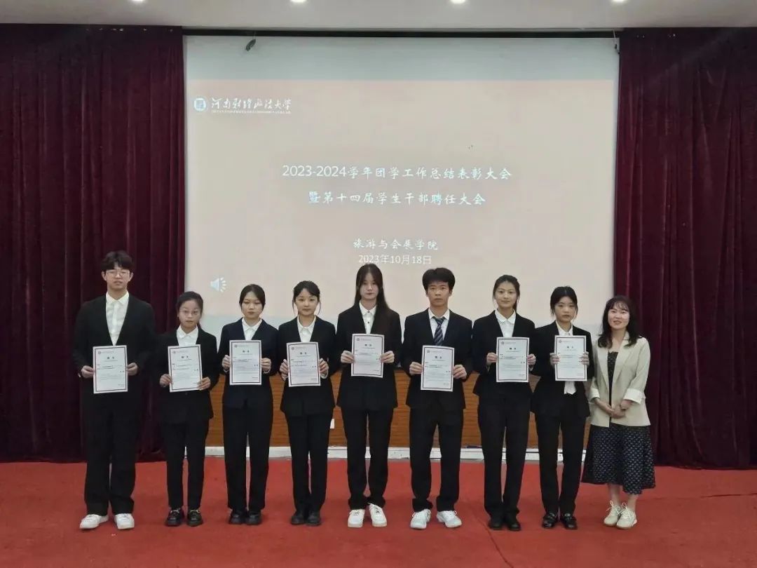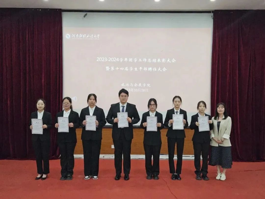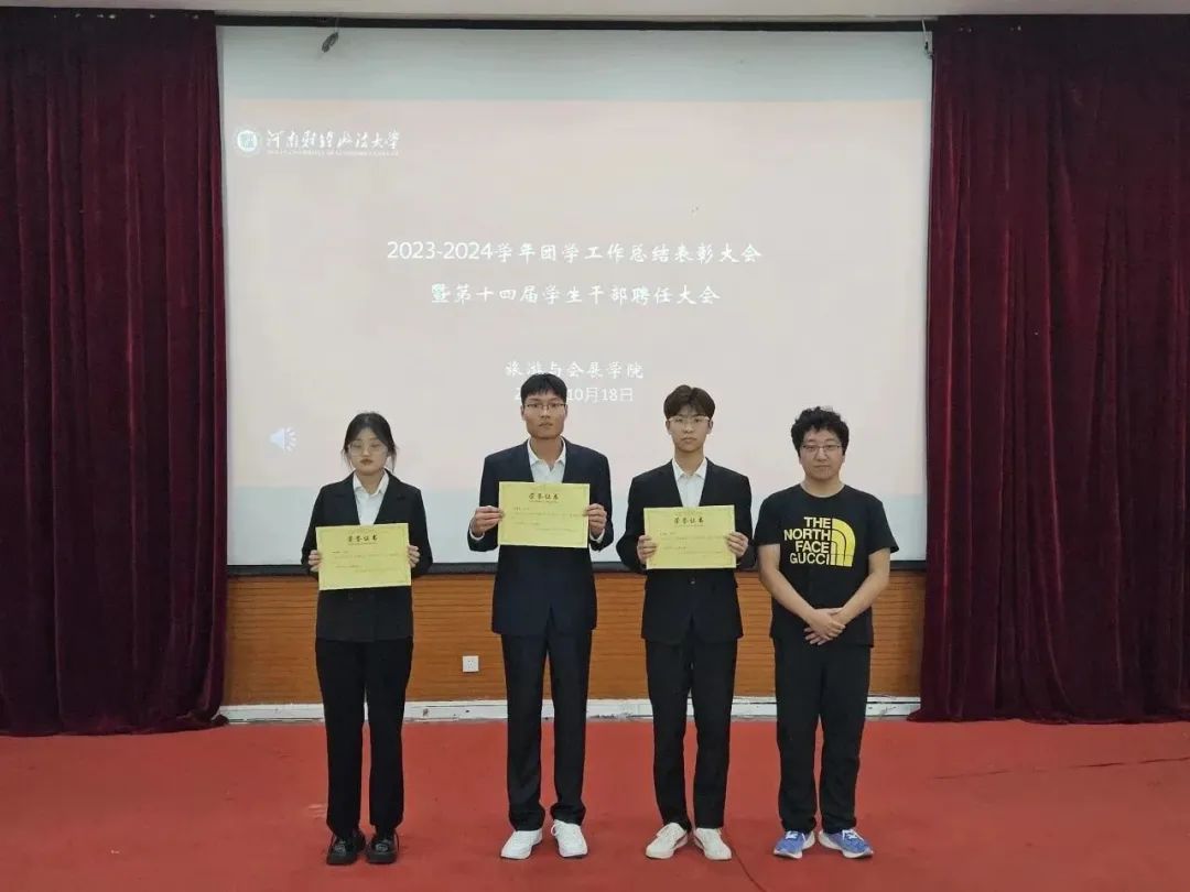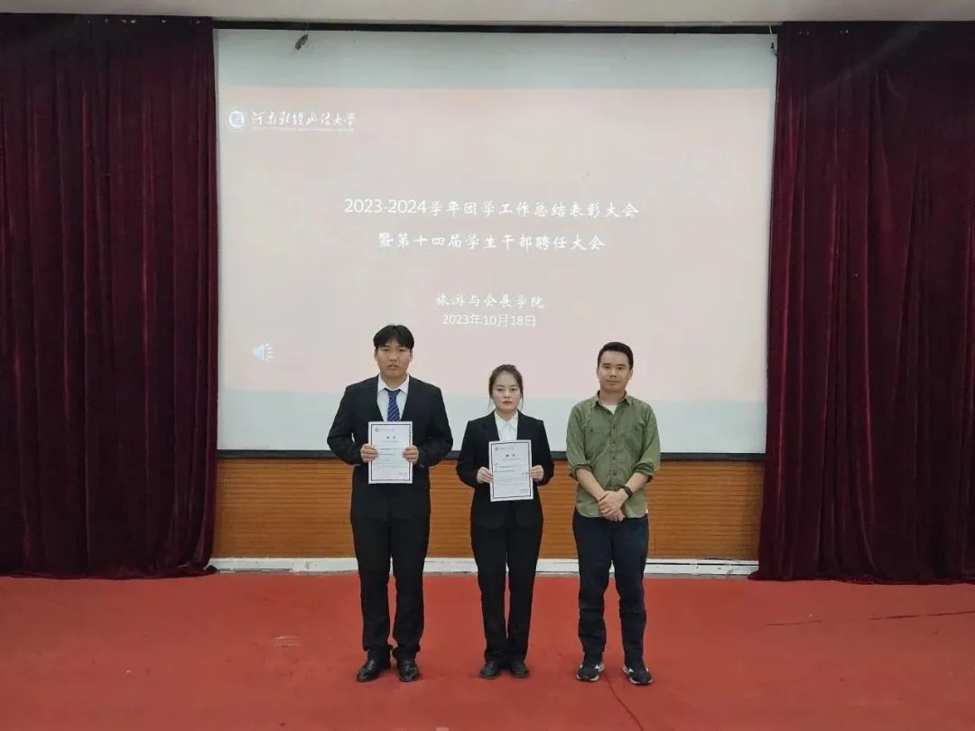 随着高亢激昂的团歌缓缓响起,本次大会拉开了序幕。会上,蔡萌首先对学院过去一个学年的团学工作进行总结。她充分肯定了十三届学生干部的辛勤付出和出色表现,并鼓励2023级学生积极参与学院组织的各类实践活动,提高自己的实践创新能力和综合素质。紧接着,蔡萌向新一届学生干部提出期望,她希望他们既要发挥好带头和榜样作用,在今后的工作中保持积极性与主动性,认真履行职责,积极为同学们服务;又要学会合理安排时间,做到工作和生活的平衡。蔡萌对旅展全体师生表示由衷的祝愿,并号召学院师生积极投身于学院各项工作中,为学院的繁荣发展持续奋斗。随后,马超宣读2022-2023学年受表彰学生名单和第十四届学生干部聘任决定的通知,并与蔡萌、杨群涛一同向受表彰同学及学生干部颁发证书及聘书。