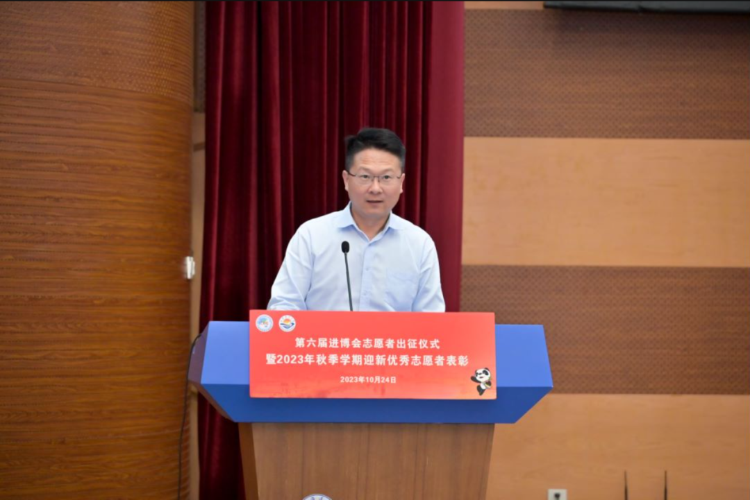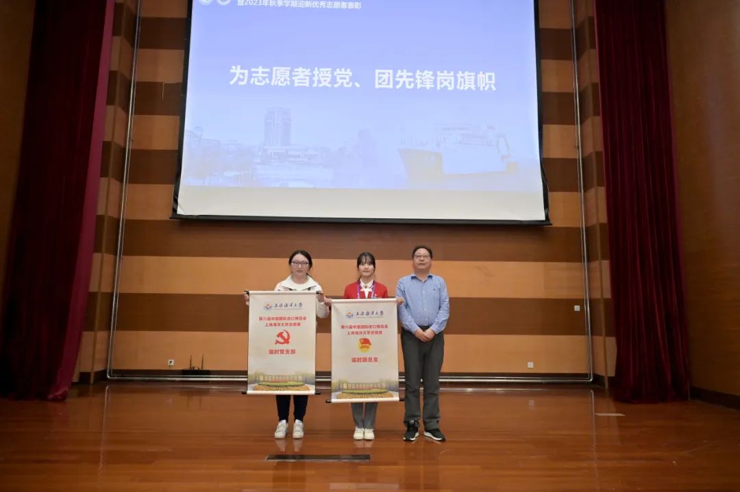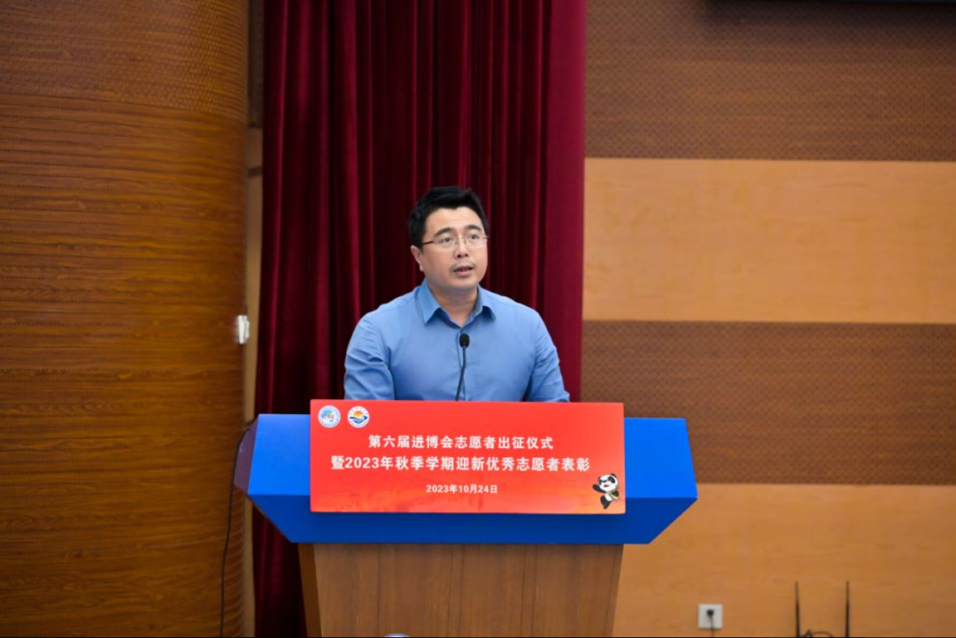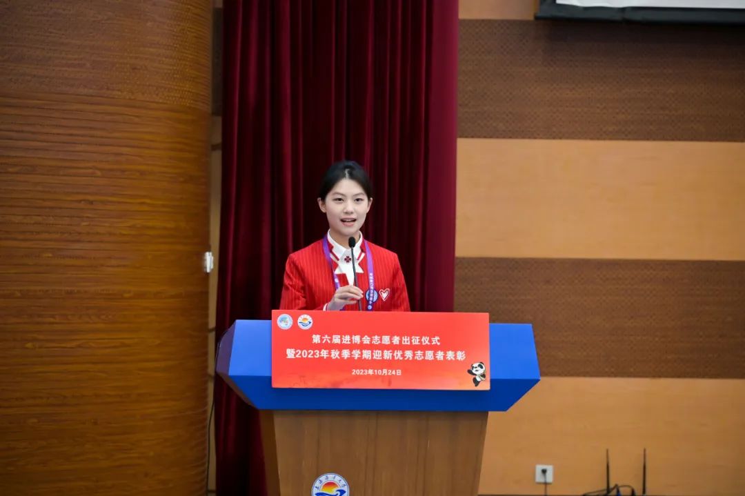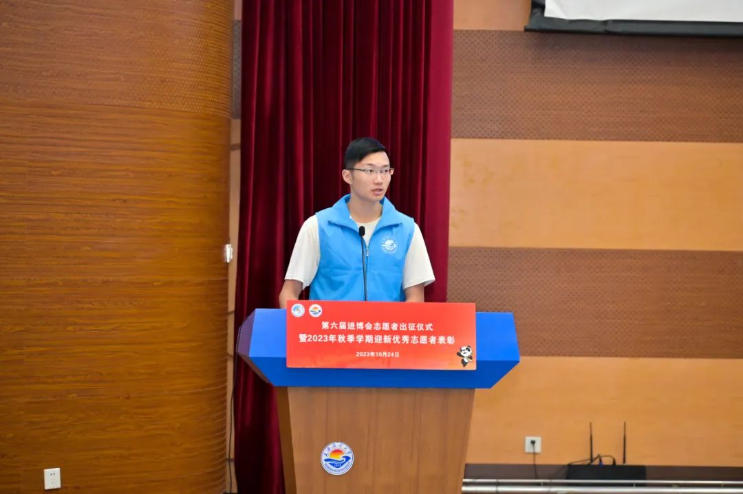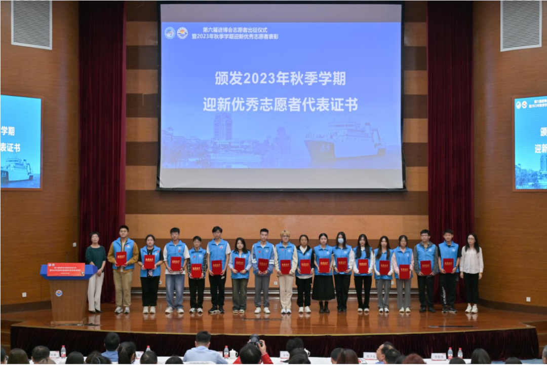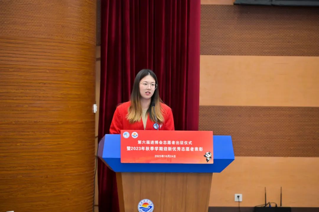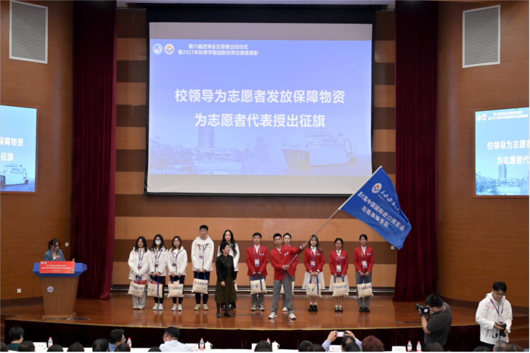 2023年10月24日下午,第六届中国国际进口博览会上海海洋大学志愿者出征仪式暨2023年秋季学期迎新优秀志愿者表彰在图文信息中心104报告厅举行。