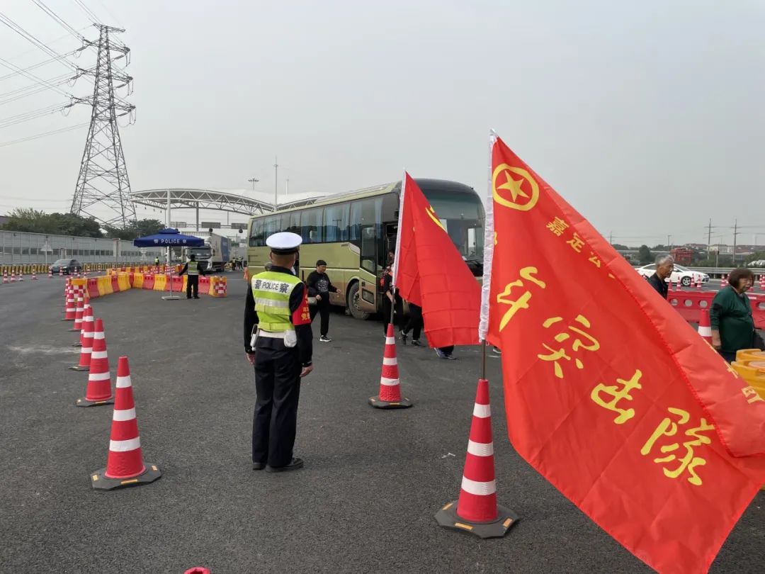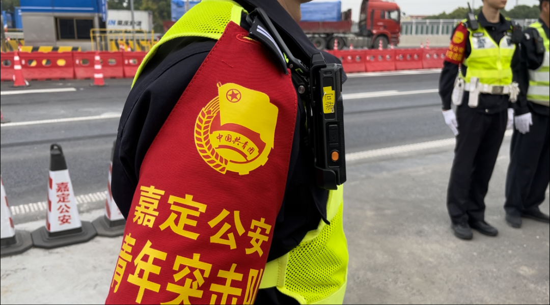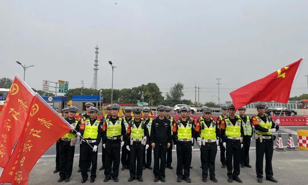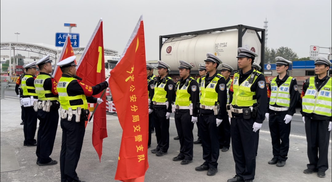 当天,嘉定交警支队党员先锋岗、青年突击队成员作为代表在嘉定朱桥检查站召开进博安保授旗出征仪式。