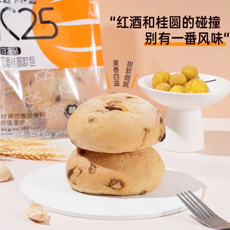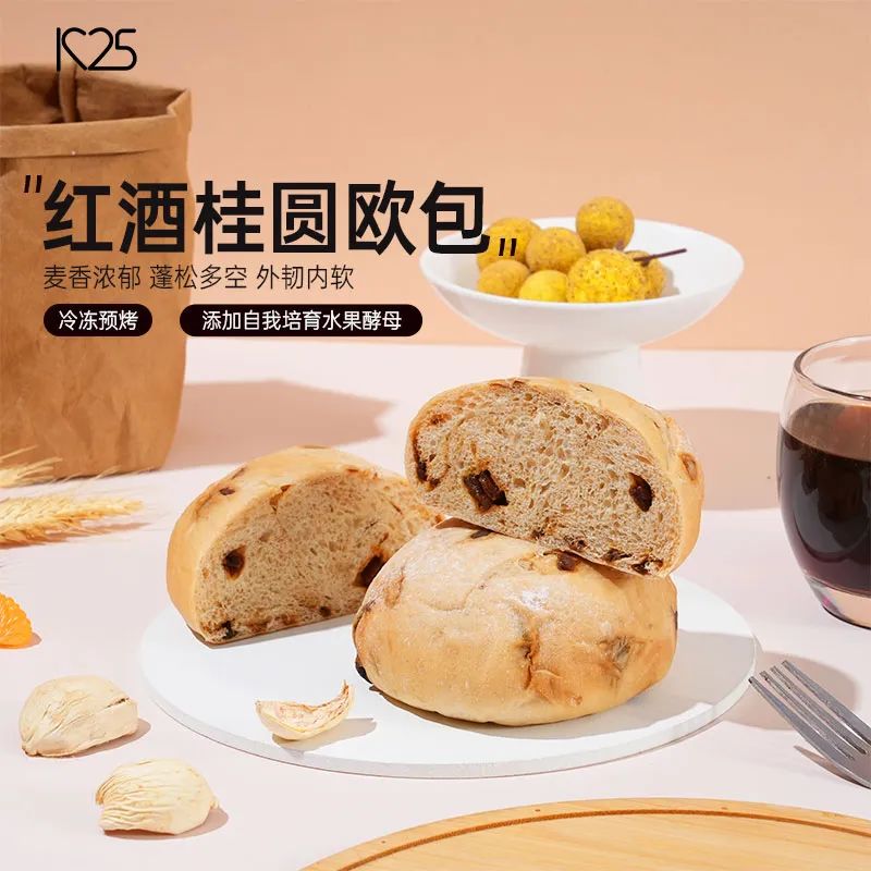 小贴士:#K25 #红酒桂圆欧包,可解冻30分钟以上,表面喷少许水,烤箱160℃上下火预热,烘烤5-6分钟,即刻享用,空气炸锅温度调至120℃,烘烤5-6分钟,即刻享用