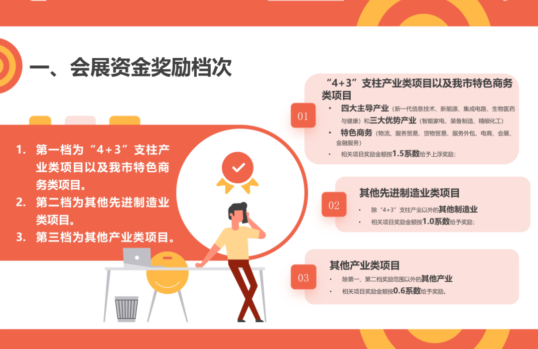 《实施细则》根据经贸类展览项目、会议项目与我市产业发展结合的紧密程度,设立1.5、1、0.6三个档次的奖励金额扶持系数,给予政策资金倾斜、优先奖励: