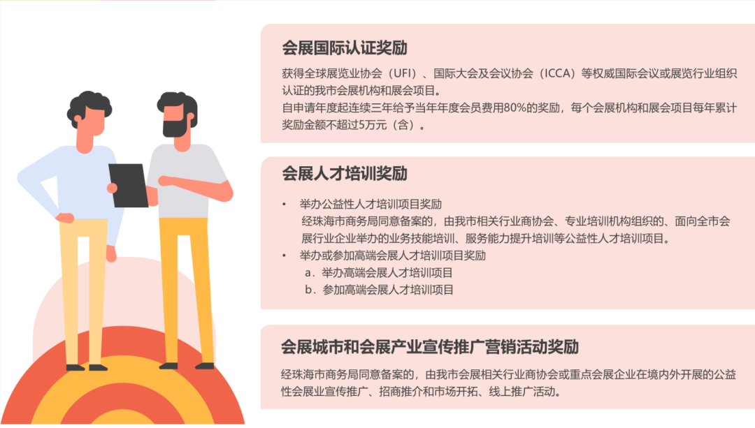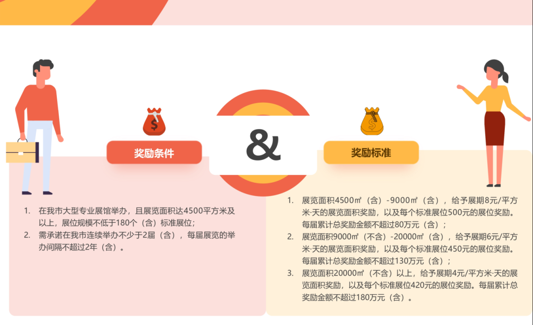 其中提到的会展资金是指市级财政预算安排、专门用于支持会展业发展的资金,重点用于奖励符合城市特色、产业第一、招商引资需求的展览和会议项目,港珠澳会展合作,会展国际认证、人才培训、宣传推广等会展业公共服务体系建设等,采取事后补助方式给予奖励。