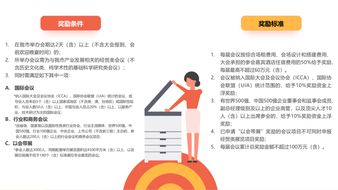 经贸类会议项目方面,《实施细则》重点扶持对我市会展业发展带动效果明显的国际会议、行业和商务会议、“以会带展”项目,并且对会议奖励计算方式进行简化和统一,采取标准化的奖励比例和金额核定,即按综合场租费用、会场设计和搭建费用、大会承担的参会嘉宾酒店住宿费用的50%给予支持,提升我市会议奖励政策的竞争力和吸引力。