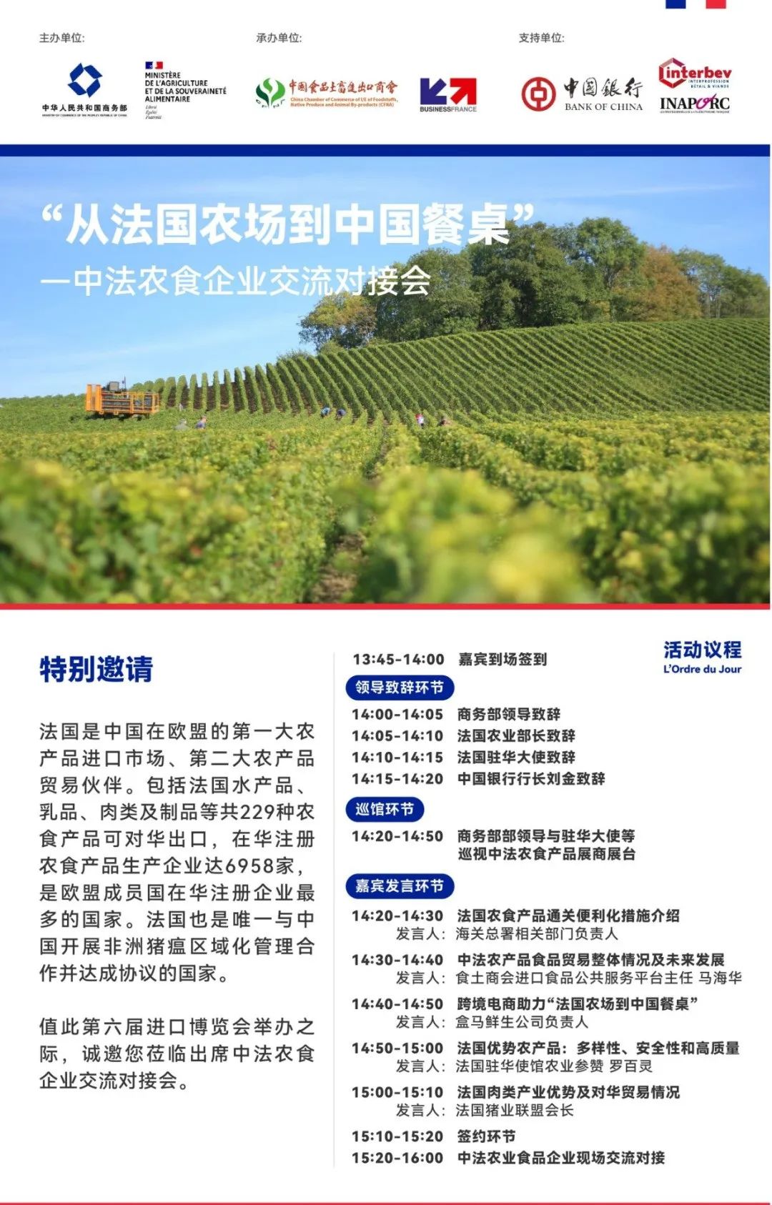 法国是中国在欧盟的第一大农产品进口市场、第二大农产品贸易伙伴。包括法国水产品、乳品、肉类及制品等共229种农食产品可对华出口,在华注册农食产品生产企业达6958家,是欧盟成员国在华注册企业最多的国家。法国也是唯一与中国开展非洲猪瘟区域化管理合作并达成协议的国家。值此第六届进口博览会举办之际,诚邀您莅临出席中法农食企业交流对接会。