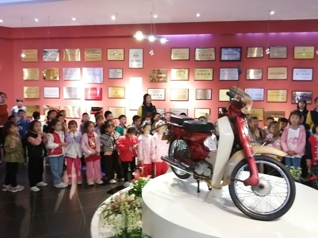 解说员又给孩子们讲解了太阳纸业的企业文化,介绍了创始人李洪信董事长在41年前创办太阳纸业集团的艰苦历程,虽然孩子们对创业的艰辛感悟是懵懂的,但是,当他们看到李洪信董事长创业时期的摩托车时,孩子们产生了共鸣,解说员的娓娓道来,让孩子们更深切的领会创业的不容易,同时,解说员借机告诉孩子,要好好学习,努力向上,我们才能做出成绩。孩子们清脆的回复,我们会努力的!