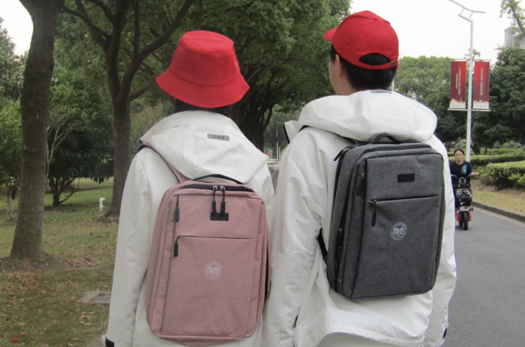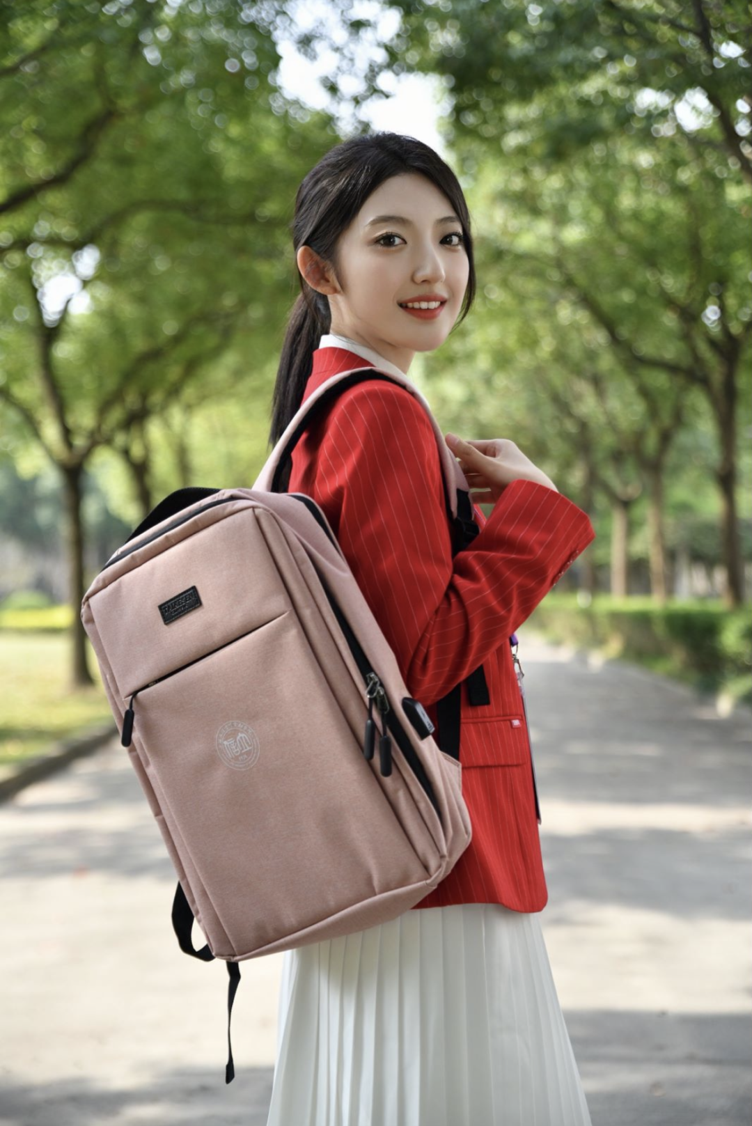 超大容量的电脑包,超充足的收纳空间,为“小叶子”的物资携带提供便利。同样,电脑包正上方印有我校校徽。男生浅灰色、女生藕粉色,简约统一,低调大方。