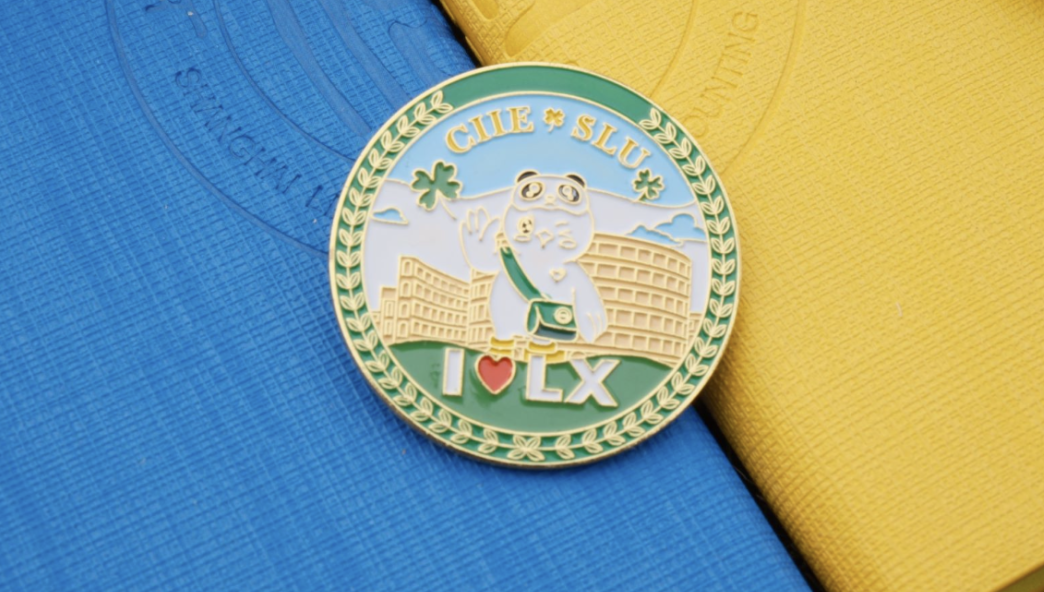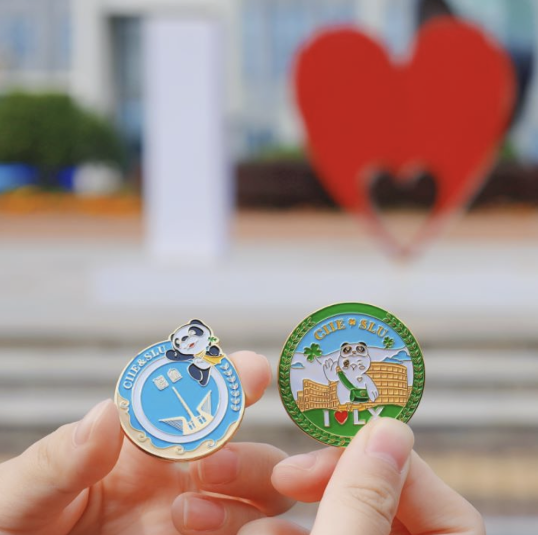 徽章以蓝色为主基调,以学校特色建筑“诚信柱”为核心。蓝色代表着自信与包容,希望立信学子不断向着成熟稳重、博大宽容的精神境界成长。与进博会吉祥物“进宝”的梦幻联动也寄寓了我校新一届“小叶子”能够在进博会志愿服务中积极进取,以昂扬的精神面貌在进博会的舞台上展现立信青年风采,彰显“诚信为本”的立信形象以及中国的发展自信与开放包容的期望。
